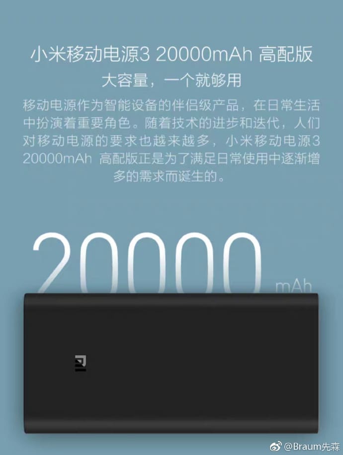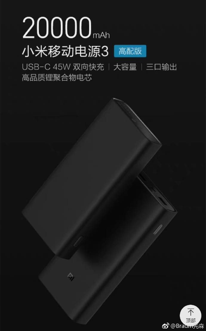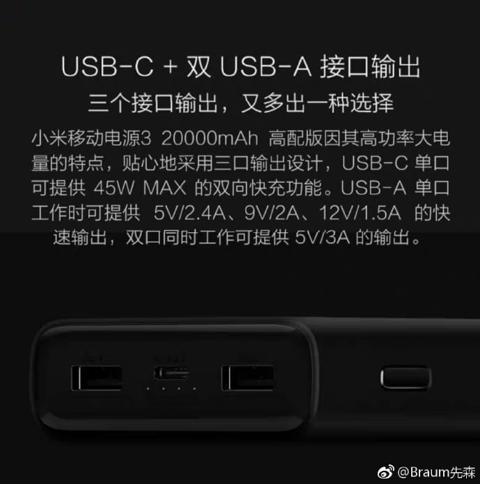 According to the leaked poster shared by a reliable Weibo user, the Mi Power Bank 3 with 20,000mAh capacity features a USB Type-C port that supports 45W fast charging and a dual USB-A port for the power output.