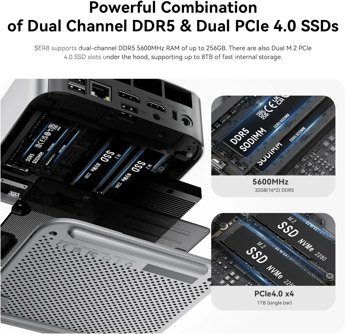 • Plenty of Ports: The SER8 offers a USB 4.0 port (40Gbps), two USB 2.0 ports, three USB 3.0/3.1 Gen1 ports, USB-C with Power Delivery, HDMI, two DisplayPorts for triple 4K displays, and two audio jacks for headphones or microphones.