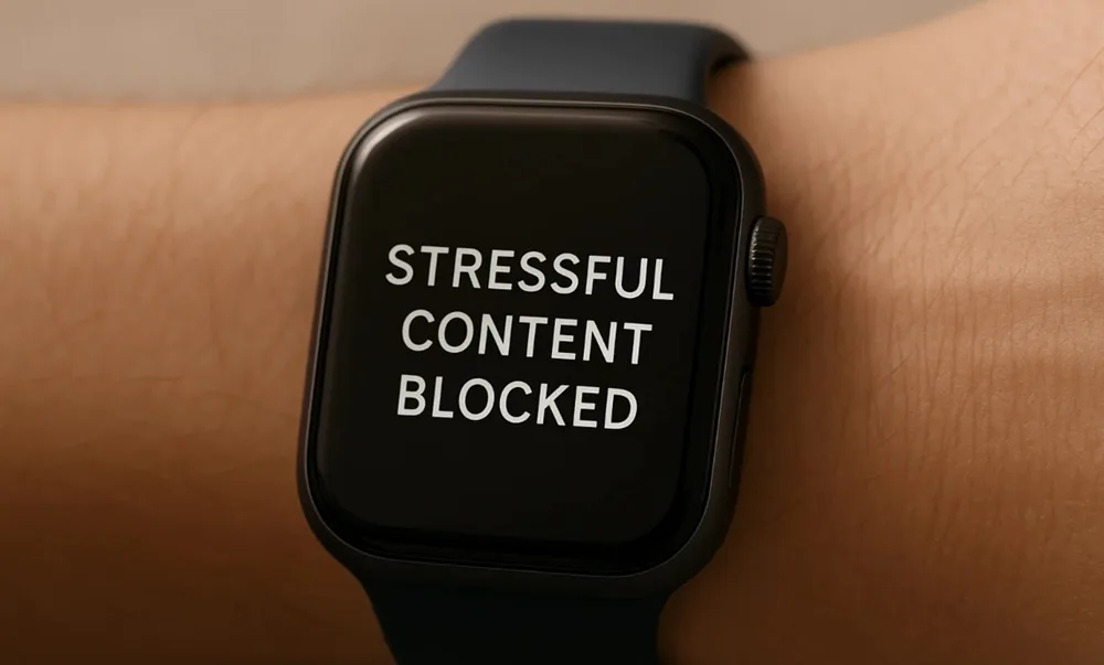 The patent describes how the AI works by looking at words, videos, and themes (like politics or sports) on your screen to decide if they might cause stress. It also uses health data from smartwatches, such as heart rate or skin response, to see how your body reacts while you view content.