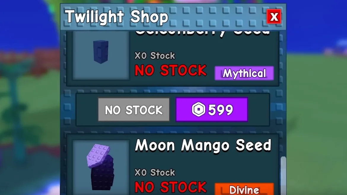 - Twilight Shop: This special store appears when the game’s sky turns completely dark during a Night Event, which happens about once every hour. Look for the shop near the center of the map where the Wise Old Owl stands. The Moon Mango seed costs 1,000,000,000 Sheckles or 999 Robux, so you’ll need to save up a lot of in-game money or real money. It might not always be in stock, so check back often or switch to a different game server if it’s missing.