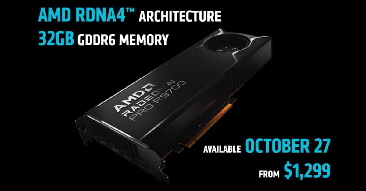 AMD has officially launched the Radeon AI PRO R9700, a powerful graphics card designed for professionals working on artificial intelligence projects. This new card stands out with 32GB of dedicated video memory – twice as much as many competitors – and is built to handle large tasks faster than Nvidia’s RTX 5080, according to AMD’s tests. It will go on sale from October 27, starting at $1,299 from select stores and partners.
